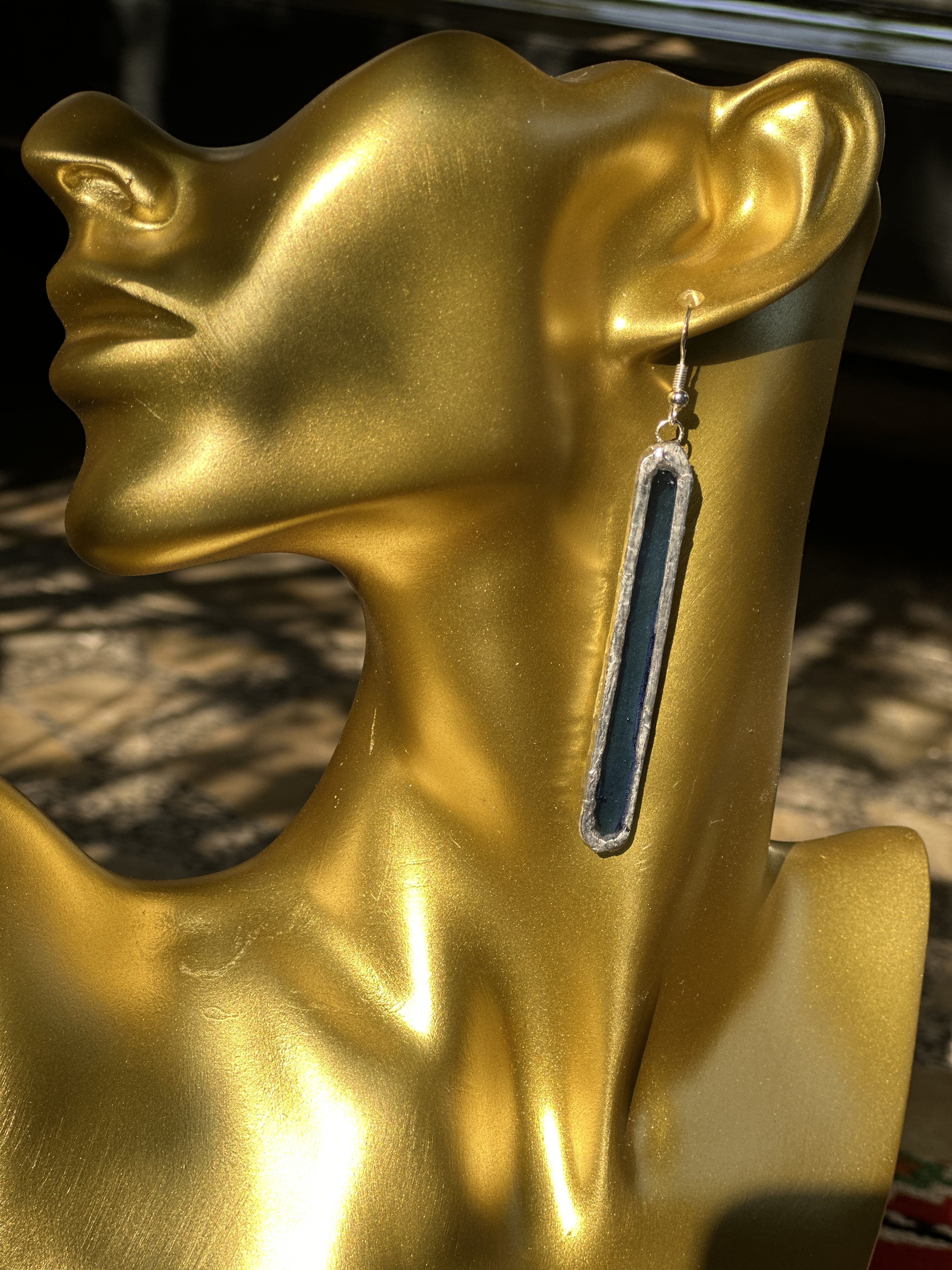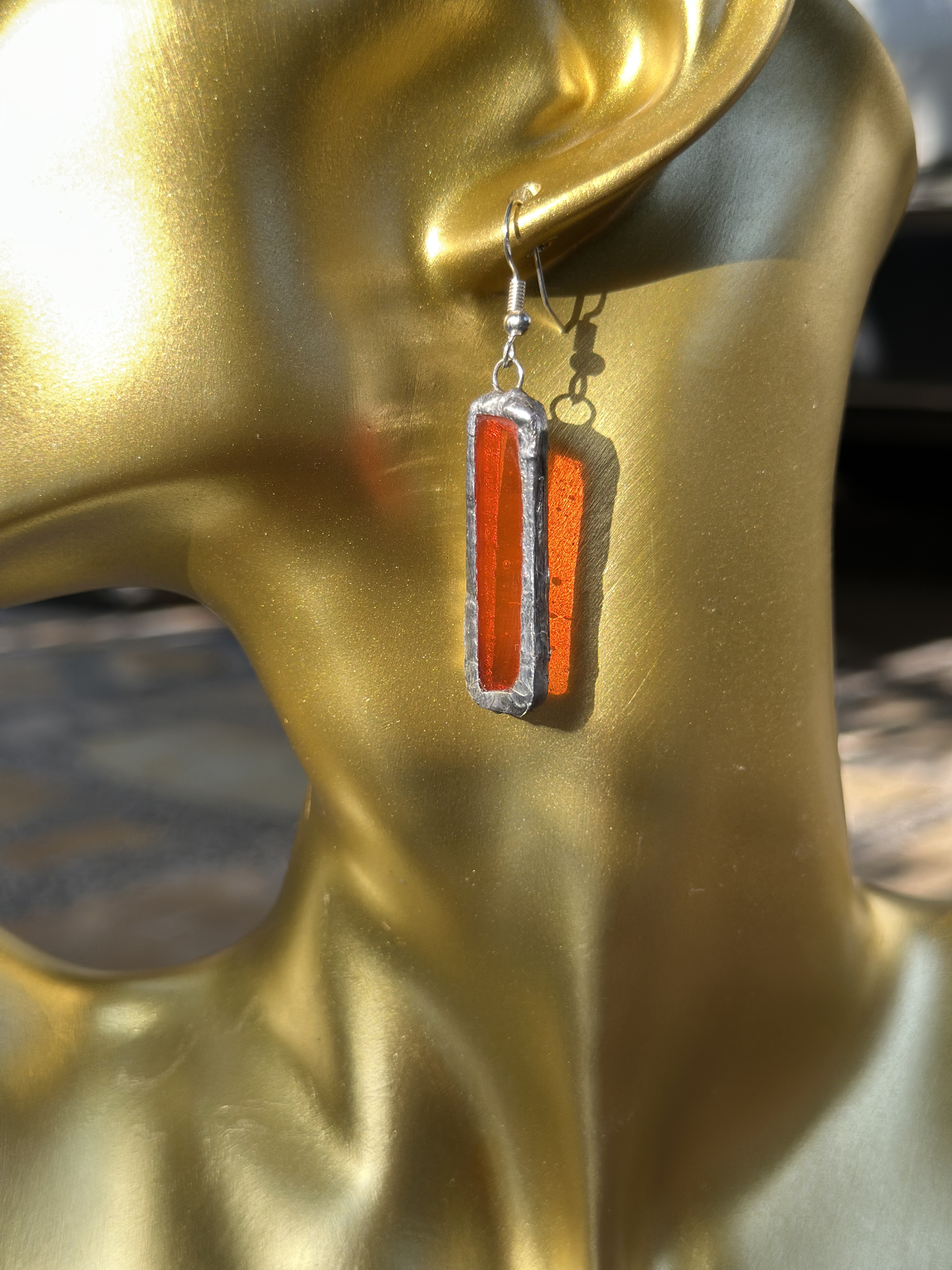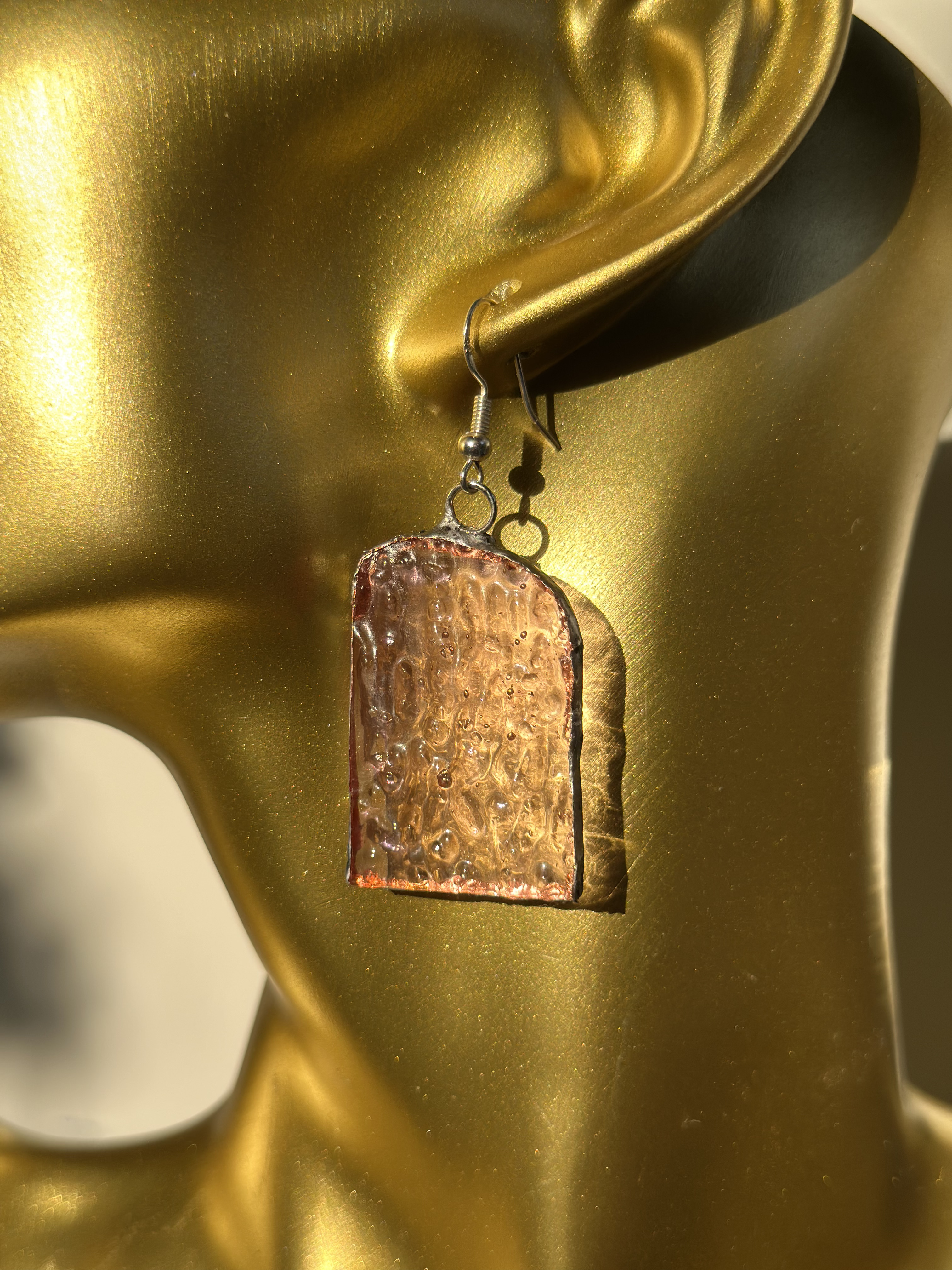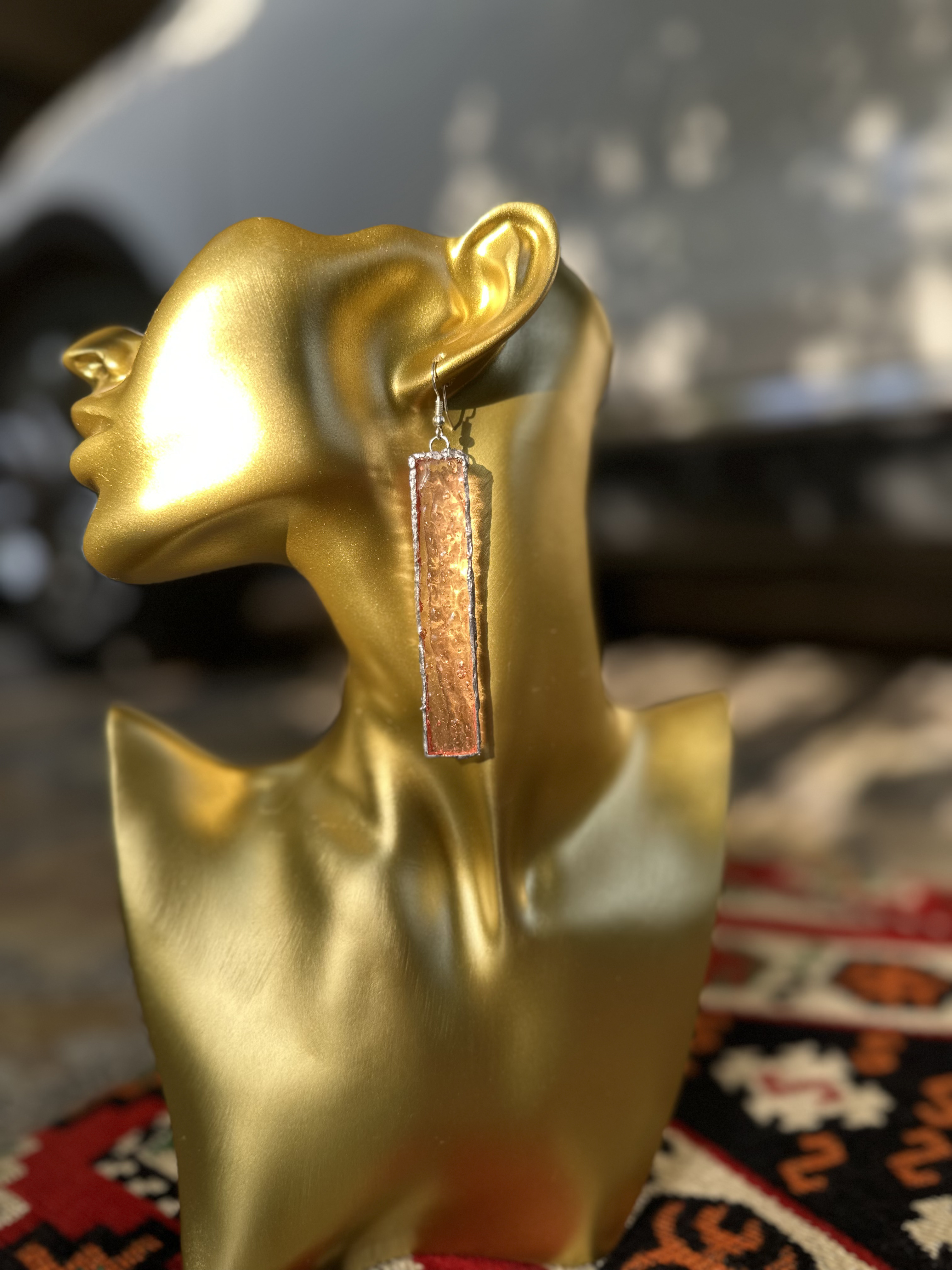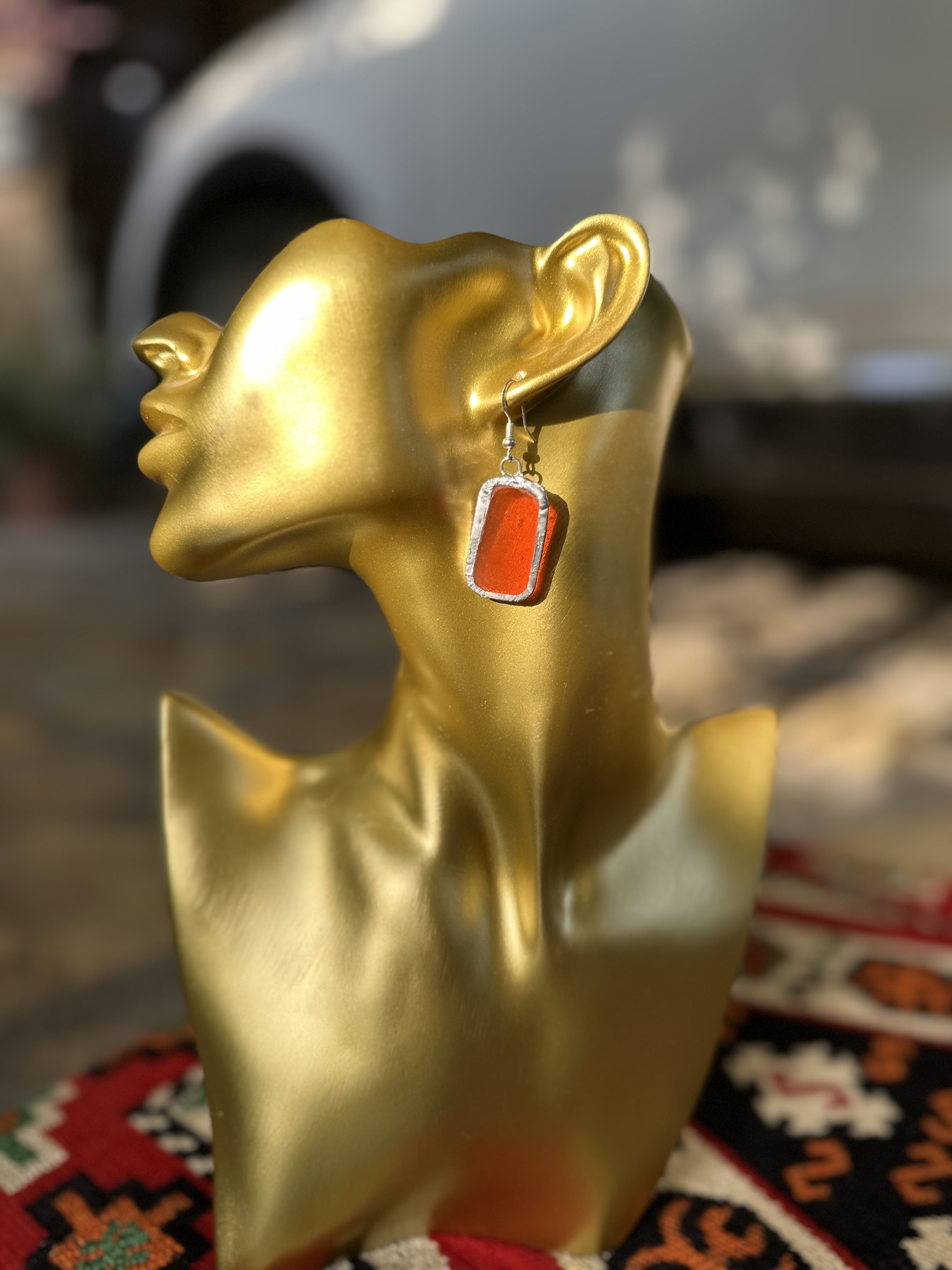 قطعة من الضوء المحبوس.." أقراط مشغولة يدوياً بتصميم هندسي قصير وأنيق، يبرز جمال اللون العسلي المعتق مع إطار فضي بلمسة يدوية ,