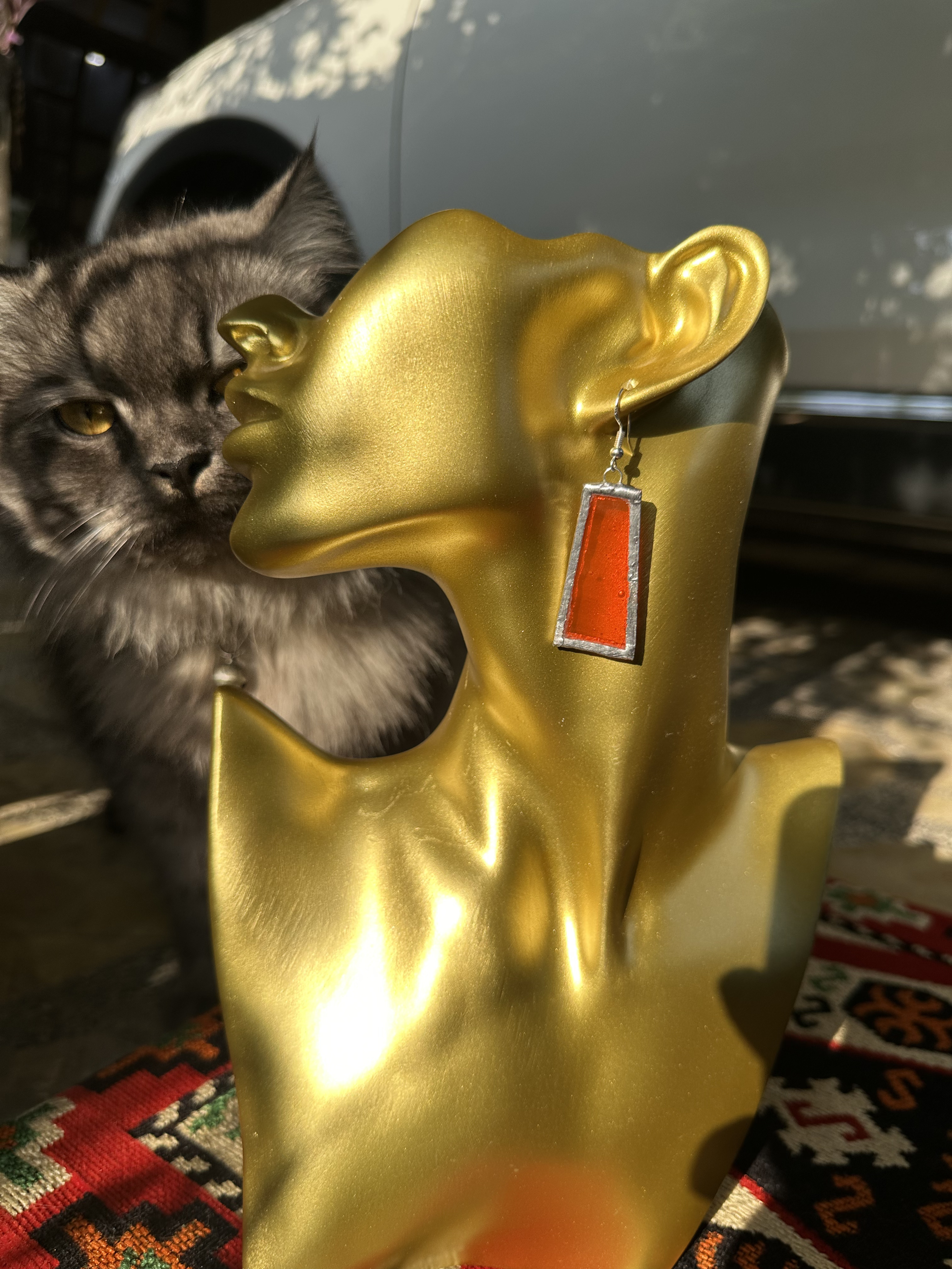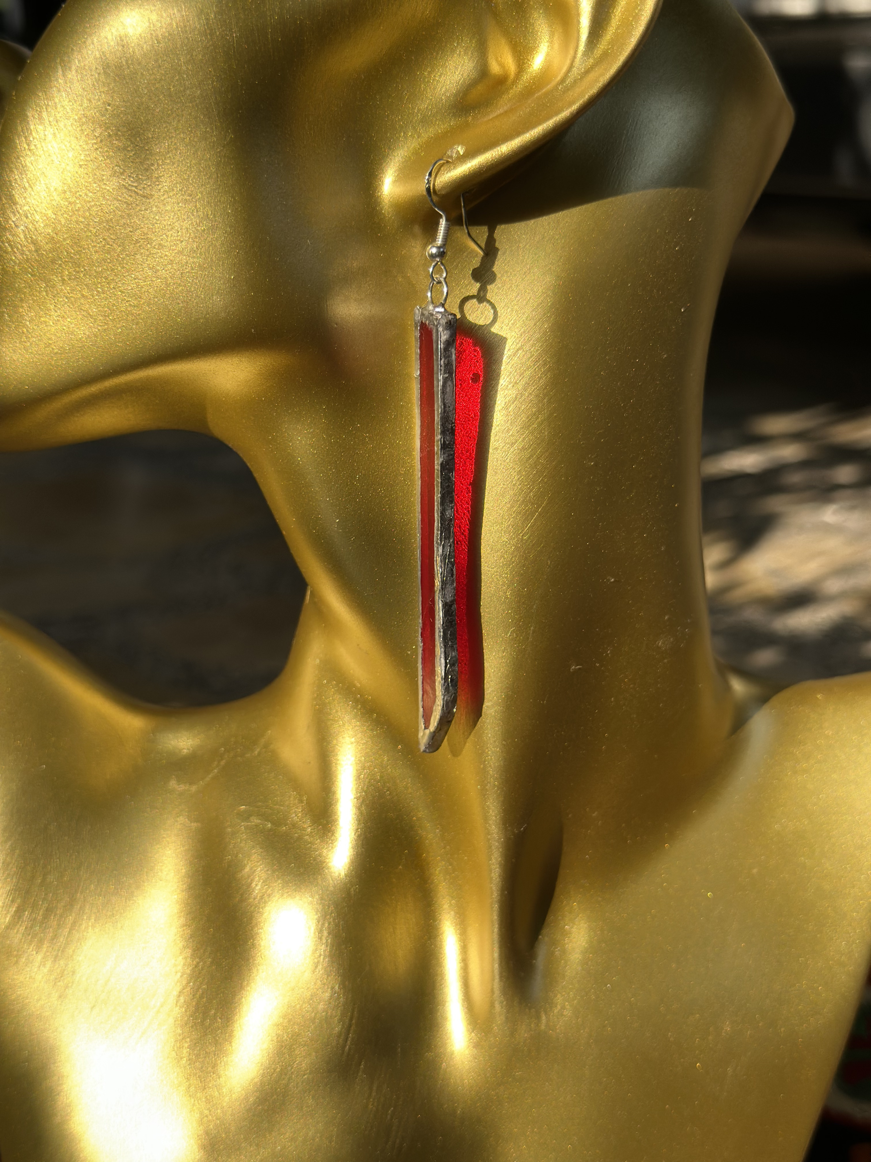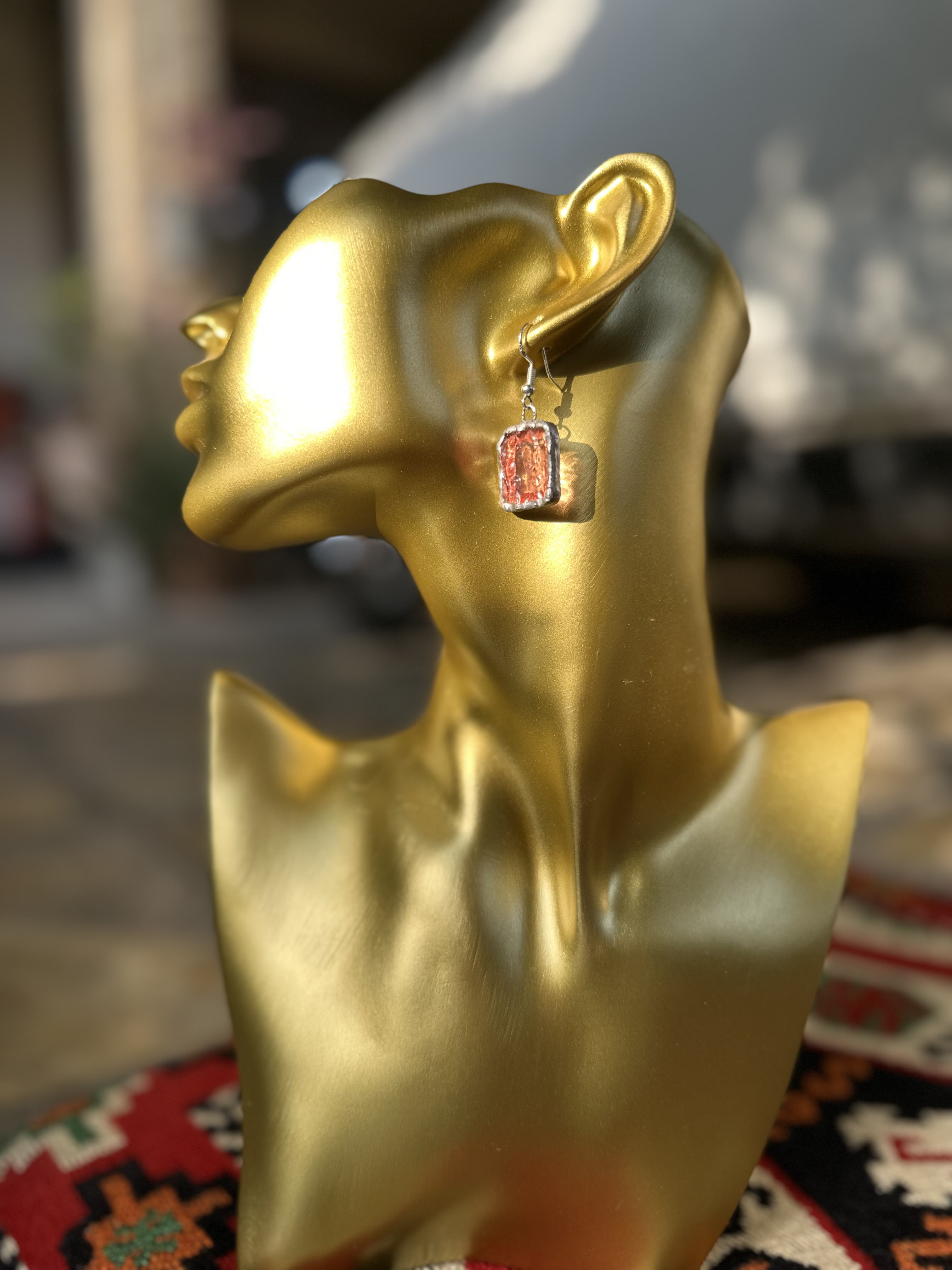 الجرأة والأناقة في قطعة واحدة.." أقراط متدلية باللون الأحمر القاني، مصممة بشكل طولي انسيابي لتعكس الضوء وتمنحكِ حضوراً لافتاً. الإطار الفضي المشغول يدوياً يضيف لمسة من "الروستيك" (Rustic) التي تمزج بين الماضي والحاضر.