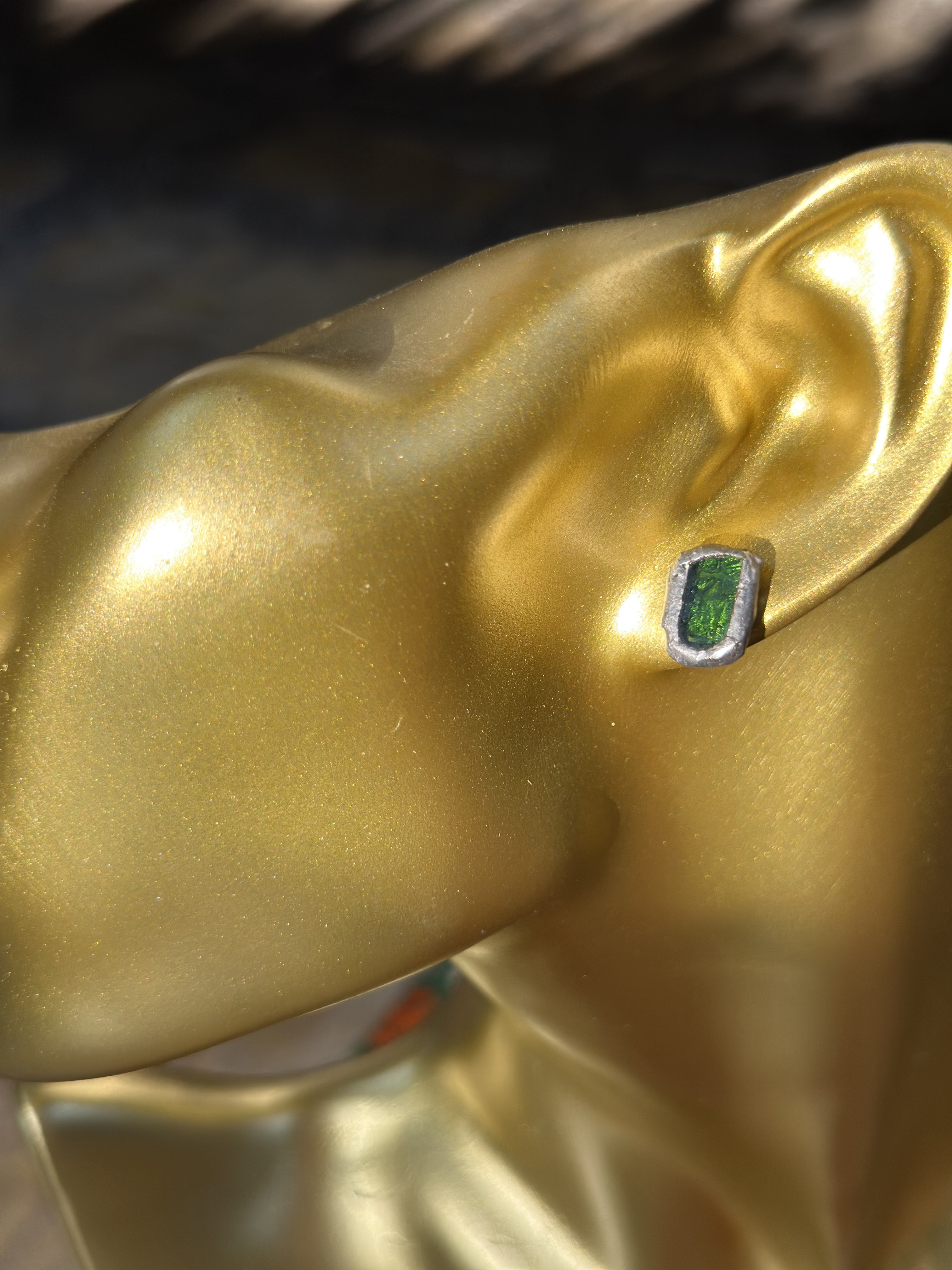 تراجي ميني (Mini Earrings) بتصميم مستطيل ناعم ... لون أخضر فستقي شفاف يجمع بين البساطة والرقي... يعطي الشعور بالعفوية كقطعة سكر ( انعكاس اللون الاخضر المتوهج على الرقبه )