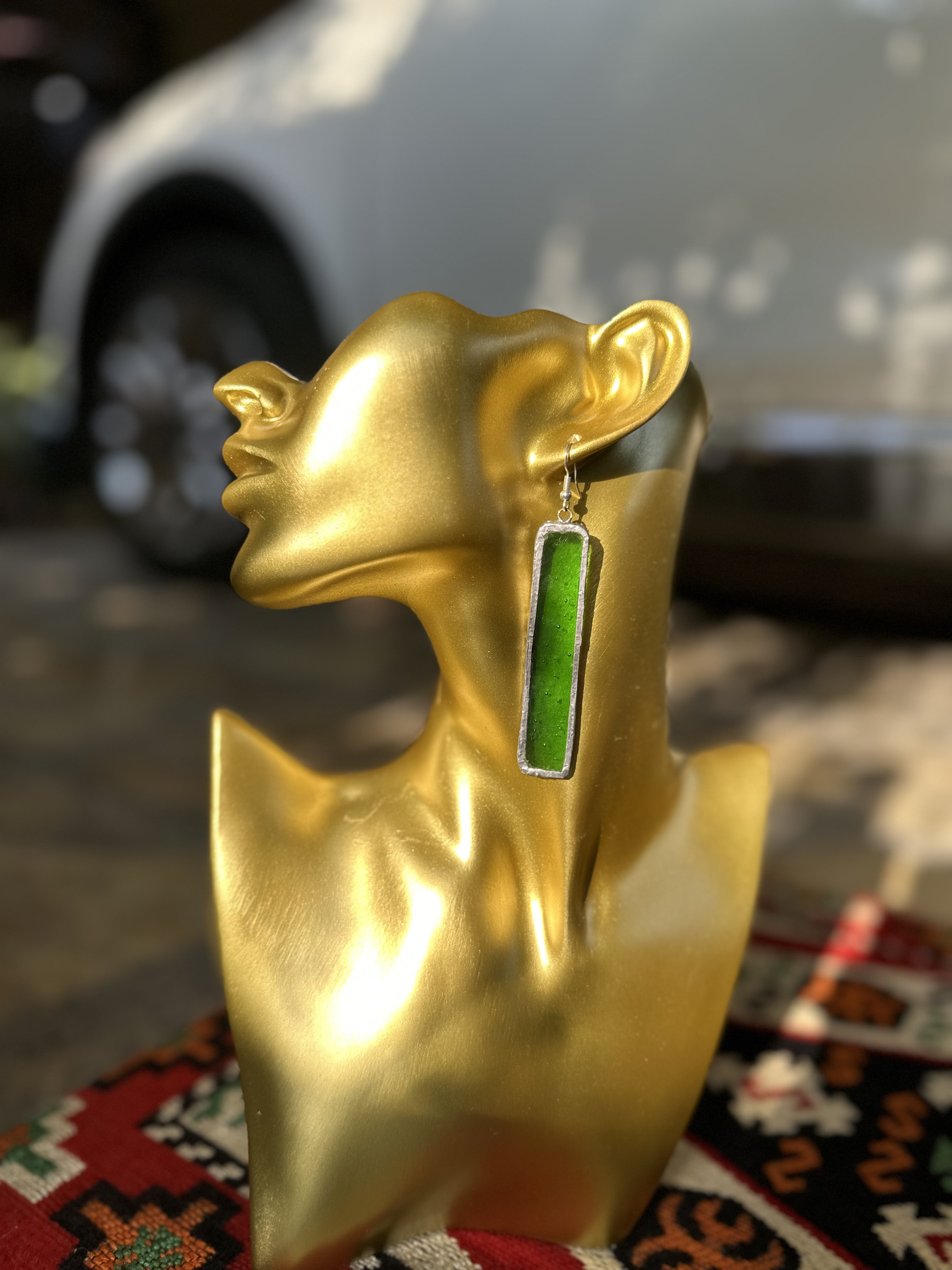 تراجي مميزة جدا ..... (تصميم واحد فقط) شكل هندسي .. مودرن stained glass ... الون الاخضر ( المُورِق) شفاف ( انعكاس اللون على الرقبه ) يعطي الشعور بالطبيعة و انتعاش .. أطار الفضي ( لون ثابت ) لا يبهت .. خفيفه الوزن